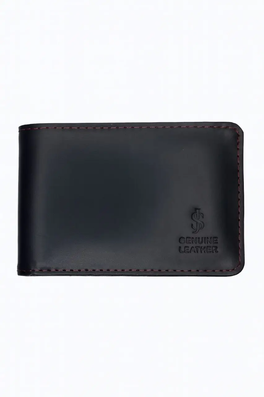 The wallet is crafted from high-quality, smooth black leather, giving it a luxurious feel and a sophisticated look that only gets better with age. The subtle, yet striking red contrast stitching along the edges adds a touch of personality and style, setting it apart from a standard black wallet. A debossed logo on the front adds a final mark of quality and authenticity.